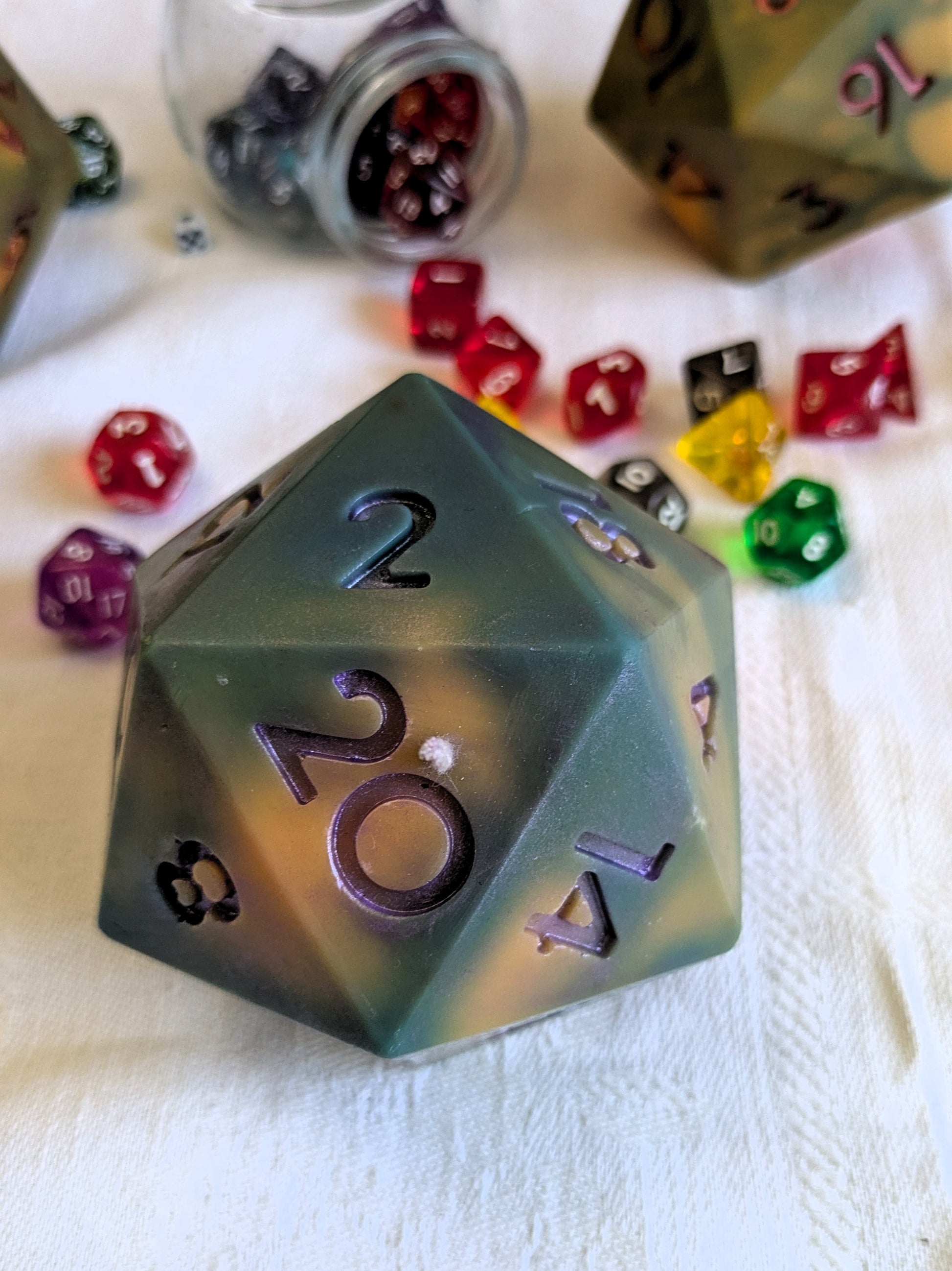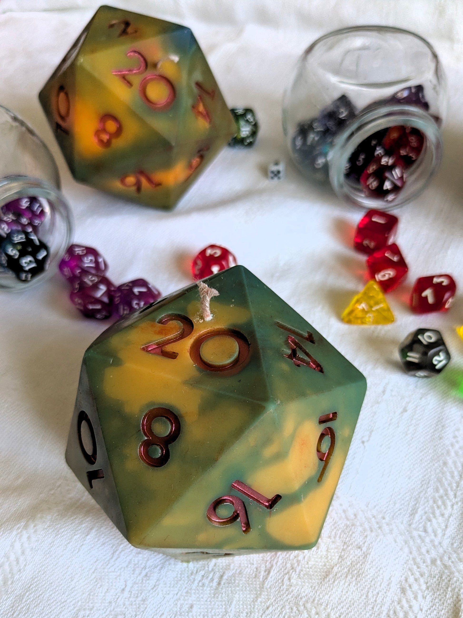 Whether you’re rolling for initiative or just rolling through life, our d20 candle brings a touch of magic—and mischief—to your space. Each hand-poured soy wax candle is shaped like a full D20, with bold marbling and vibrant inking that gives it an epic, otherworldly look.