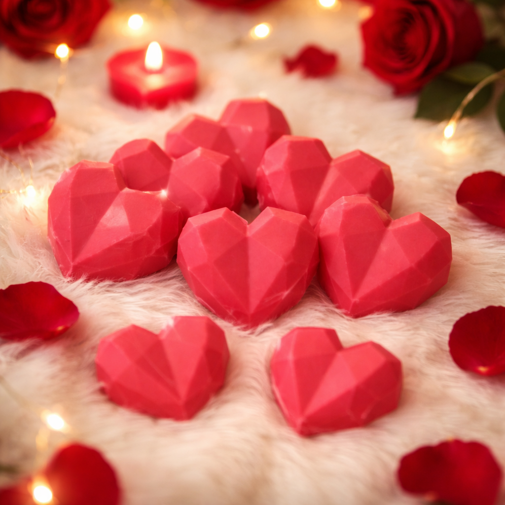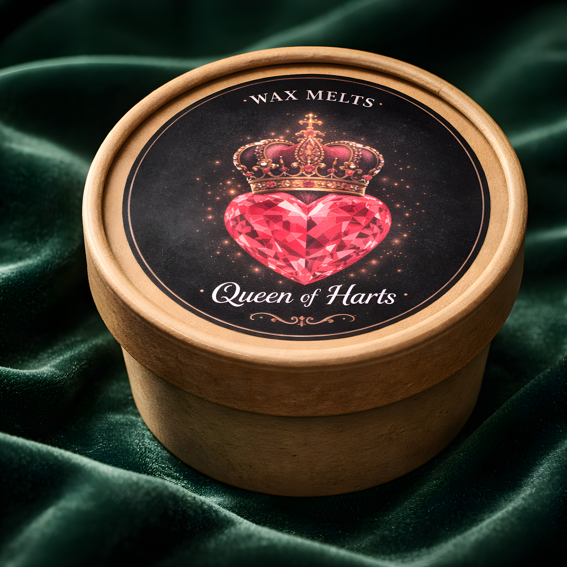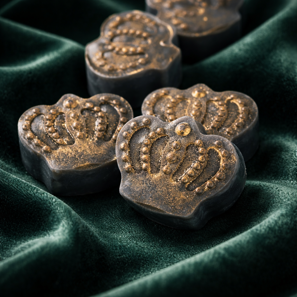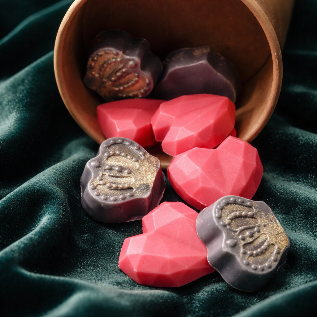 Ovaj upečatljivi set spaja crveni vosak u obliku srca i crne krune posute zlatnim mica prahom, stvarajući snažan vizualni kontrast dostojan prave kraljice (i raspoloženja).